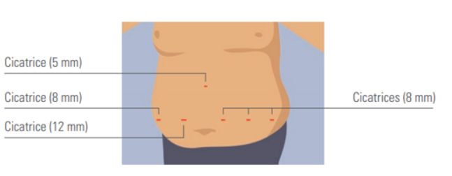 Une caméra est introduite par un petit orifice dans la paroi abdominale et des instruments de travail sont insérés par cinq petits autres orifices.