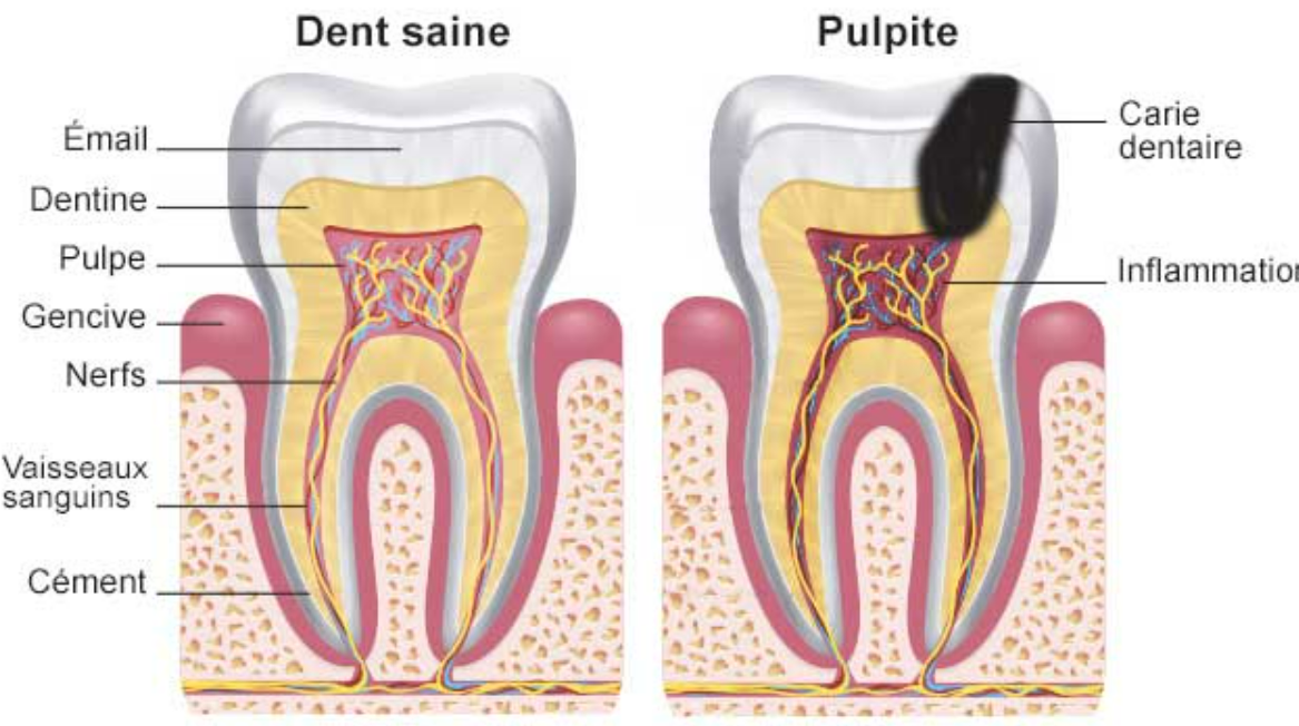 Souvent appelée « rage de dents », la pulpite dentaire est une inflammation aigüe des vaisseaux et des nerfs de la dent appelés pulpe. Cette maladie peut avoir différentes causes :