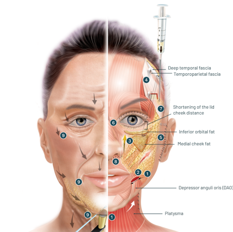 - Muscle, de la zone de graisse superficielle de la pommette (« malar fat pad »). Ainsi que de la zone de graisse profonde (SOOF).