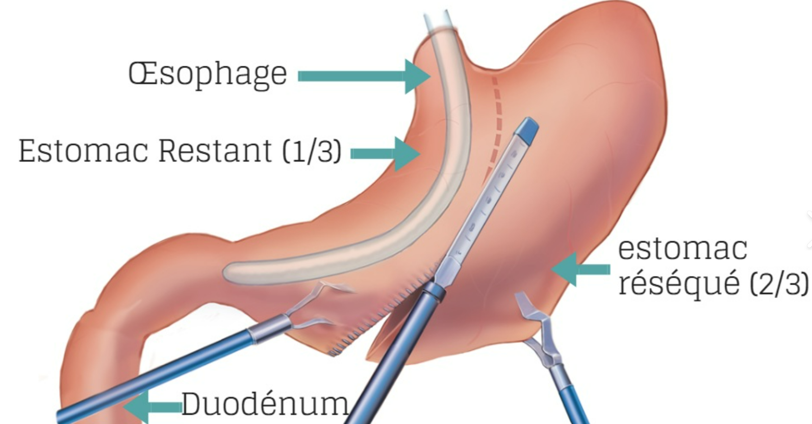 Ensuite, environ les 80% de l’estomac est retiré . L’estomac est réduit à un tube étroit.